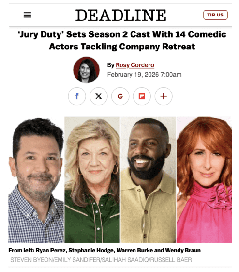 With more than 80 TV and film credits, including Grey’s Anatomy, This Is Us, and four seasons on Netflix’s Atypical, I star in Jury Duty Presents: Company Retreat, the Emmy-nominated comedy series, playing a formidable private equity executive at the center of a corporate takeover.